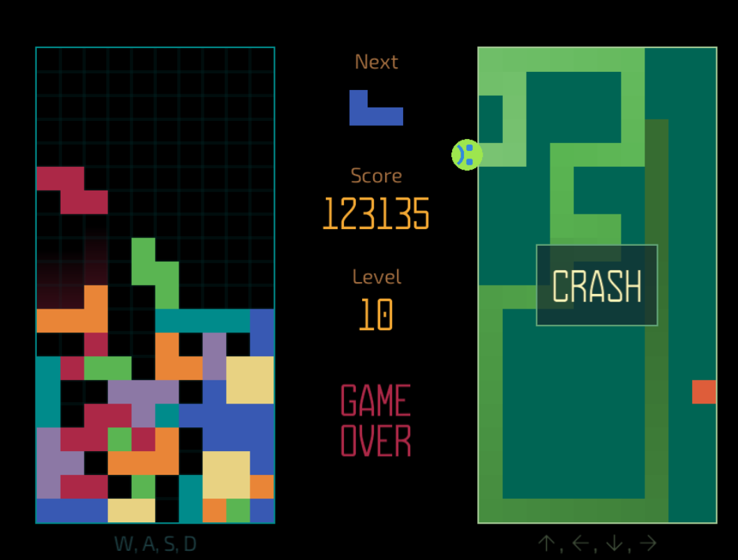 super charming game! I love how it's stylized and think the multitasking is amazing. The buffer on the snake makes it so much more interesting joined with the buffer of tetris pieces falling. also also the sounds actually help a lot when trying to focus on one screen while waiting for an apple to be collected on the other. sometimes, i did find my input not registering when pressing two seperate-screen buttons at the same time, but it might just be my silly keyboard; i still adapted to just double checking my placement on both screens.